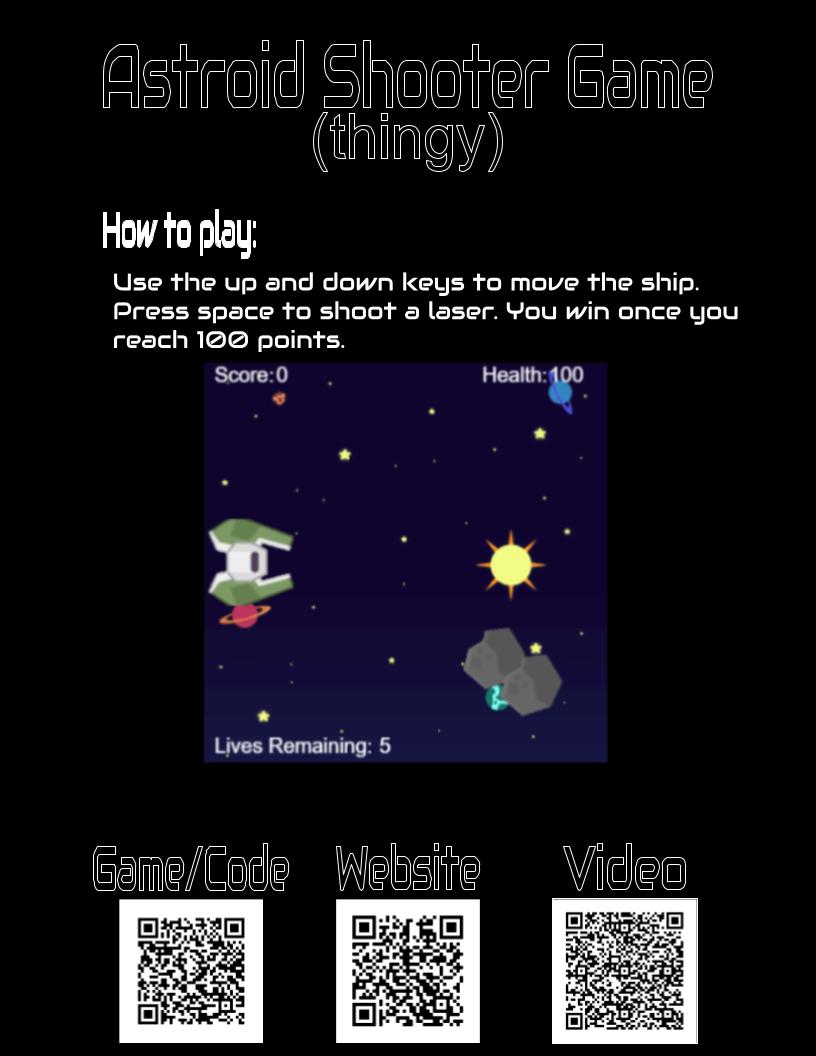 Use the up and down keys to move the ship, Press space to shoot a laser. you win once you reach 100 points