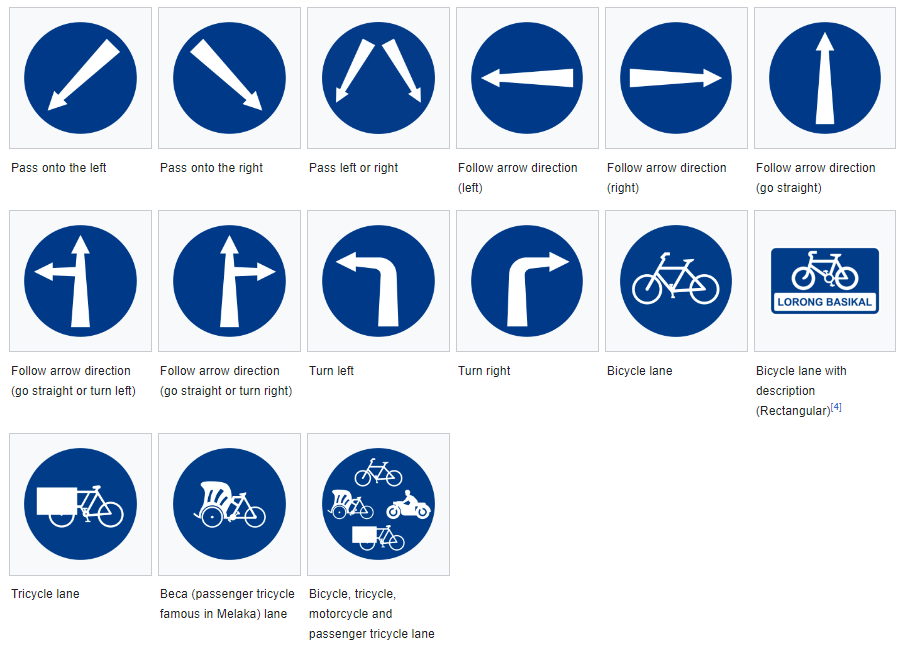 Mandatory signs come in blue background with white pictograms. These signs are placed at locations where drivers are required to adhere.