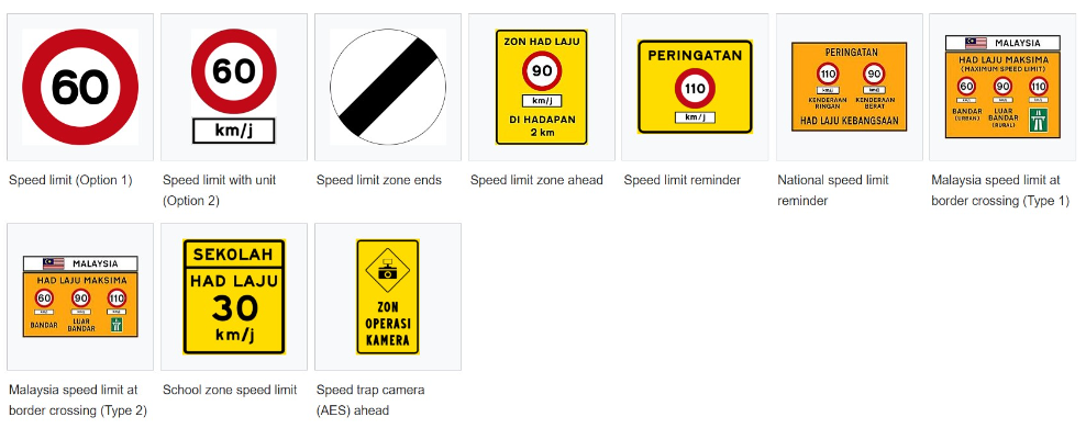 Speed Limit Signs vary in colour such as red, white, yellow and orange. Drivers are required to follow as it shows the particular speed limit for the road. The speed limits are to prevent potential accidents or mishaps from occuring. If a driver goes over the speed limit, it might cause the car to skid. If drivers fail to follow the speed limit, they will be at risk of getting fined when caught by the poilice.