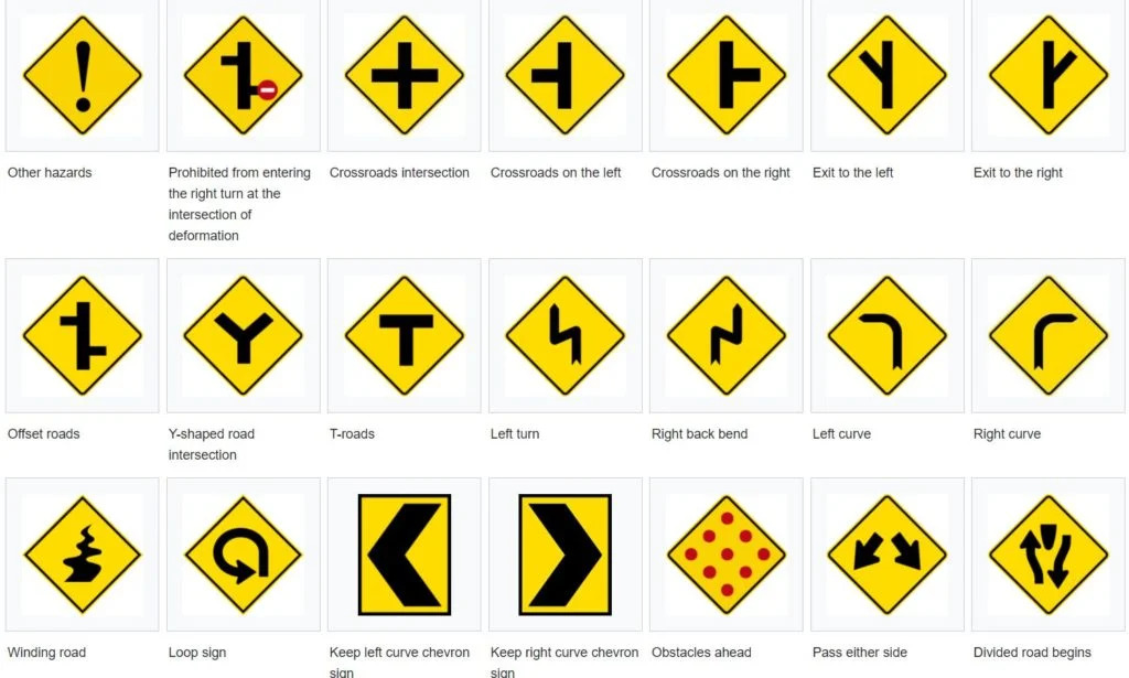 The warning signs are placed to warn road users of a potentially dangerous traffic situation. Most of the signs have diamond shapes and yellow background, contrasting with their black pictograms. You can see them alongside the road, preparing drivers for what lies ahead.